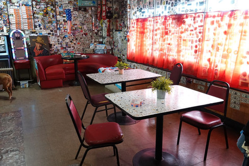 Le motel de l’époque n’existe plus, il reste la dalle au sol. Le seul symbole encore debout est le panneau qui indiquait sa présence. Le château d’eau quant à lui est couché parterre réduit à l’état de simple ruine métallique. La caravane en métal, un modèle ‘Airstream’ est toujours présente. A côté de cet endroit mythique se trouve le café et non loin de là, la station service.