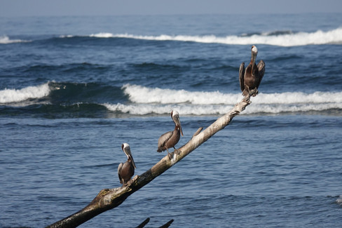 On constate qu'il est difficile de rejoindre notre camping depuis le bord de mer. Une personne d'entretien d'un complexe hôtelier nous fait traverser la propriété qui possède une magnifique piscine donnant sur l'océan. Nous passons devant les grosses branches d'arbres où visiblement d'autres pélicans sont venus se rassembler.