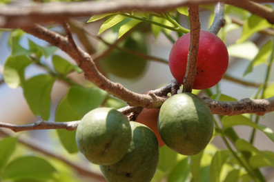 Nous revenons vers le camping en passant par l'intérieur des terres en empruntant un chemin au milieu de cultures de noix de coco. Mais ce n'est pas tout, on trouve des manguiers, des papayers, des corossoliers mais aussi des fleurs plus belles les unes des autres. Quelques maisons illustrent leurs murs pour donner un peu de gaieté à leurs demeures vétustes. Je ramasse une belle grosse noix au sol, la secoue et j'entends du liquide. Muni d'un caillou 'à peu près pointu', je casse la coquille protectrice pour ne garder que le fruit que nous prendrons plus tard.