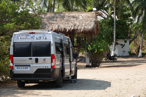 Nous arrivons à un semblant de camping recommandé par l'application Ioverlander avec des avis positifs. A notre arrivée le cadre est paradisiaque juste que l'ambiance ici est 'zen', on va vite le comprendre en faisant une brève visite... le semblant de douche est à l'eau froide avec un simple rideau à tirer entre deux cloisons de feuilles de palmier, le semblant de cuisine est alimenté avec de l'eau puisée dans une grosse barrique, le semblant de toilettes, (à noter quand même au passage qu'il y en a deux un pour 'hombre' et un pour 'mujer'), possède une porte qui ne se ferme pas.