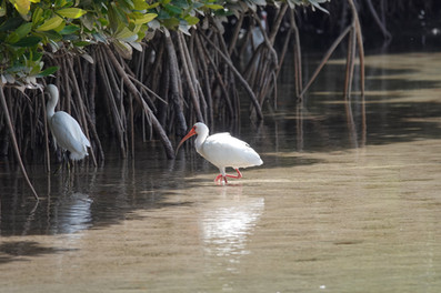 Nous décidons de refaire le circuit de balade de la veille et aller explorer les environs et sur un autre côté de la plage, nous arrivons à des mangroves où des hérons blancs ont élu leur domiciles. L’eau ici est verte et calme, les arbustes des mangroves se reflètent dans l’eau. C’est plaisant à voir.