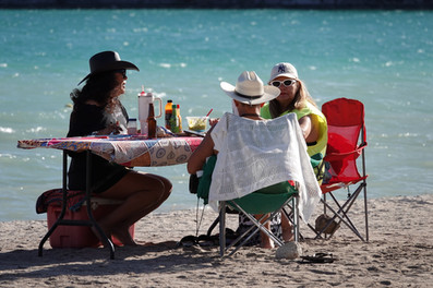 La plage en forme de baie est occupée principalement par des gros camping-cars américains et canadiens qui viennent ici pendant 3 voire 6 mois pour profiter du soleil et de la beauté qu’offre ce site pour un coût de 200 pesos (10 €) par jour.